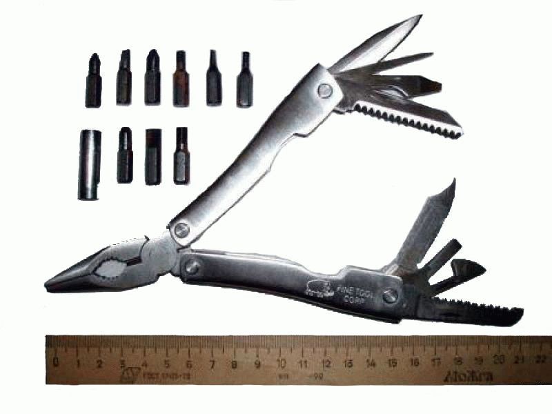 Универсальный инструмент включает в себя небольшой ножик, плоскогубцы, пилки, шило, отвёртки, консервный ключ,  в общем -  полный набор инструмента для мелкого ремонта. Незаменим  дома и в велопоходе!