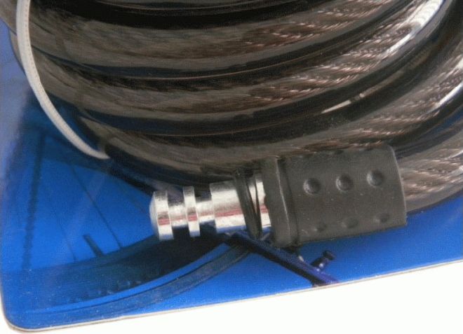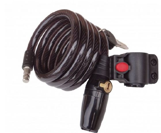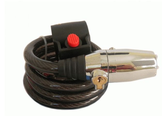 Велозамок тросовый с сигнализацией предназначен для пристёгивания электровелосипедов, электросамокатов, электроскутеров к элементам ограждения и другим конструкциям, а в случае отсутствия подходящих предметов, - для замыкания одного из колёс.